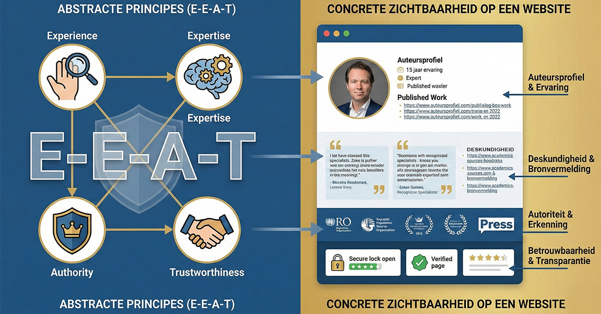 Voor veel ondernemers is dat precies het probleem. Ze hébben kennis en ervaring, maar Google ziet die niet automatisch. Vakmanschap bestaat in de echte wereld, maar moet online herkenbaar worden voordat het meetelt. Daarmee wordt EEAT geen theoretisch model, maar een zichtbaarheidsvraagstuk.